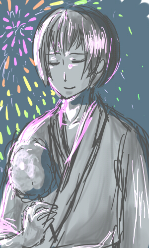 そして綿あめ片手にすげえ安らかな表情になってしまったw 計画性のない絵をかくからこうなるんですねorz でも祭りの風物詩で彼が持ってて絵になりそうなものって思い浮かばなかったんだ……。金魚とかだったらよかったのか。まぁいいや。