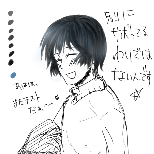 いやぁ、今まではいい加減なアニメ塗りというよりも誤魔化し塗りをしていたわけですが、いい加減ある程度はできるようにならないとなぁ……というわけで、ちょっと練習してみた。(というか、顔描けないからそれくらいしかできない←) 今回は…結論から言うと仕込みが足りなかったよ……下地はもっと丁寧に、かつ考えて塗るべきだった。うん、ダメダメでした、完敗です。あ、あと上の奴は顔は後で適当に描きました。深夜テンションそのまま表してるので自分で見ててキモイです←